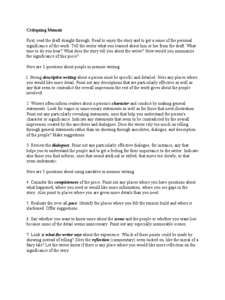 Critiquing Memoir Writers Narrative from imgv2-1-f.scribdassets.com Neither should it be regarded as a jousting match between the researcher and the reviewer. You can also find spaces dedicated to polishing query letters and synopses, and a board that aggregates critique guidelines to make sure every member is giving — and getting. For workshops, the opportunity to critique a student manuscript should improve the reviewer's skills as a literary fiction writer as well as provide feedback to the many critiques by fellow students are never read, or at least taken seriously, by authors. Our critiques are neither brutal nor gentle, we just give what we think needs to be given. The process of critiquing an article is truly a challenging one. Each critique evaluates a speech by a public speaker to show their strengths and weaknesses by example. Let's discuss the negative critical content of critiques. Reviews for characters and stories.