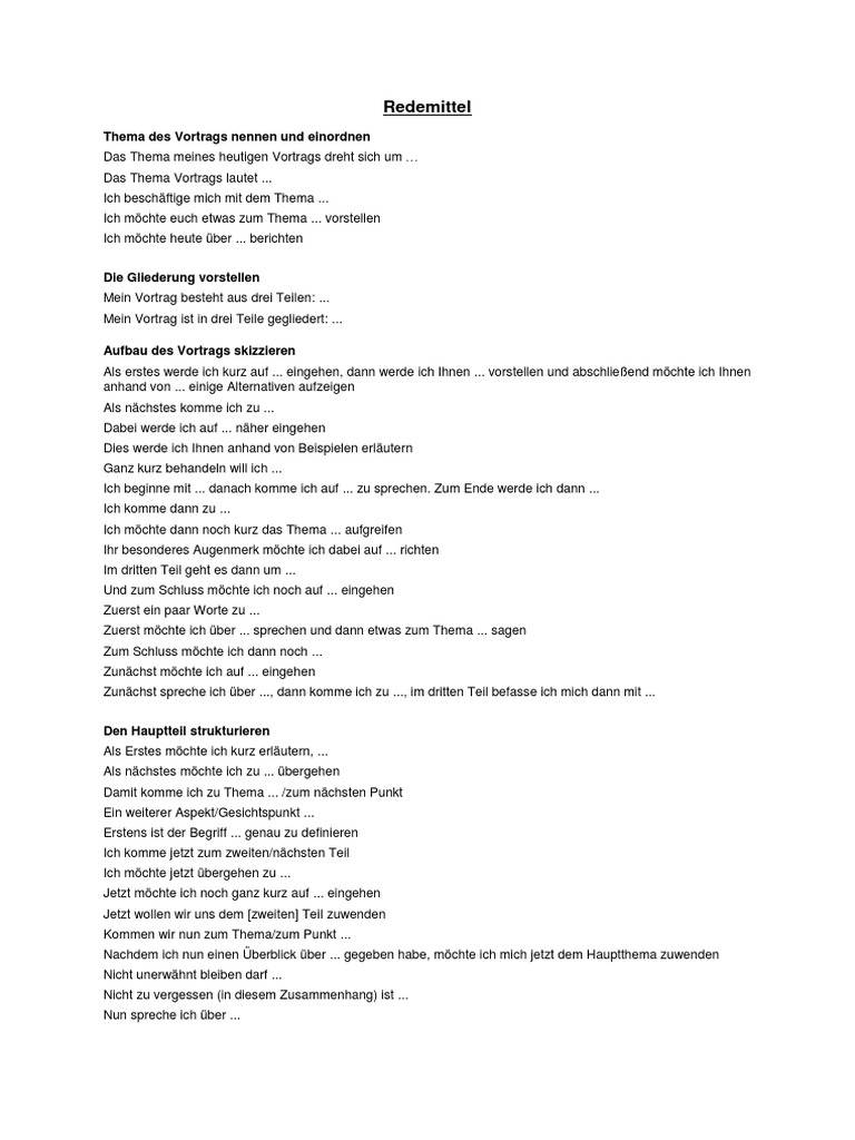 Möglichst das interesse der zuhörer wecken. 30 sekunden begrenzen redemittel für die. (vielleicht durch eine rhetorische frage / schlussfolgerung am anfang.) die gliederung / die struktur des vortrags kurz nennen.